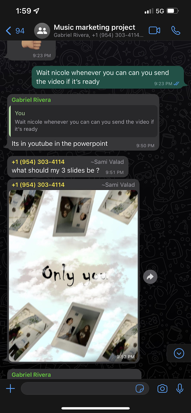 The process our team decided to follow was to first create a group chat will all the members so we could communicate efficiently when we were not together in person. Then each class we would divide our tasks and each member would do what they needed to do individually however if we had any questions we would talk to each other. Also, we decided to brainstorm in class about what marketing strategies to use and which ones wouldn't work with our goals and ideas. When the time to record arrived we decided that my house would be the best since my room has a view of the streets and we wanted to incorporate a shot of a couple walking down the street. Gabriel as our artist was the main actor, Sami and myself were extras and helped with lighting, setting, composition, etc, and Nicole recorded and edited the video.